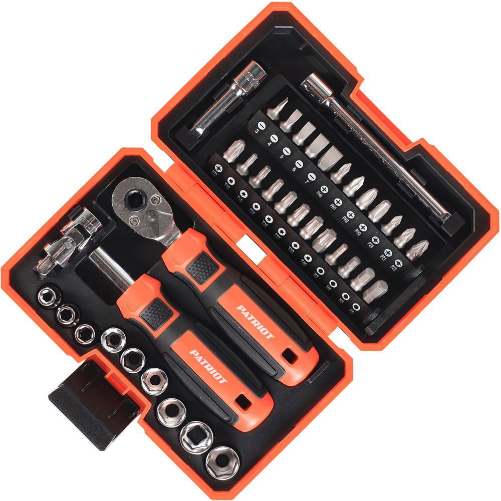 Набор инструментов PATRIOT SPS-38 для выполнения различных видов ремонтных и сборочных работ. Поставляется в пластиковом кейсе и состоит из 38 предметов: ключа-трещотки 1/4”, комплекта торцевых головок (9 шт.), удлинителей, карданного шарнира, отвертки-битодержателя и комплекта бит (24 шт.). Большое количество разнообразной оснастки позволяет работать с разными крепежами. Инструмент и оснастка изготовлены из износостойкой углеродистой стали, что значительно увеличивает срок службы. У инструментов удобная рукоятка, которая надежно лежит в руке и не выскальзывает во время работы. Отверткой и трещоткой комфортно работать в условиях ограниченного пространства благодаря храповыму механизму.