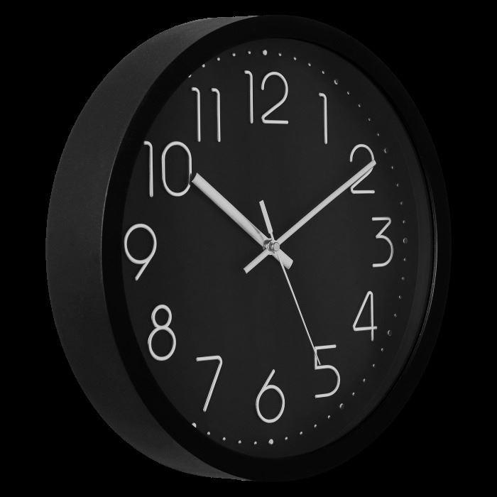 Часы настенные, модель 76760782, размер 305 Х 50 мм, материал пластик,стекло минеральное,обод широкий чёрный матовый, рельефные цифры серебро