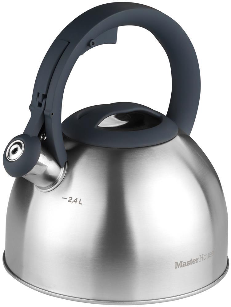 Чайник из со свистком 2,4 литра. Нержавеющая сталь 304 (18/10). Цвет сталь, ручка графит. В ИНД, КОРОБКЕ В25хШ22хД21 вес 0,78кг БЕЗ КОРОБКИ Высота 24,3см ШиринаХДлина 21,5х19,5см Вес без коробки 0,6кг