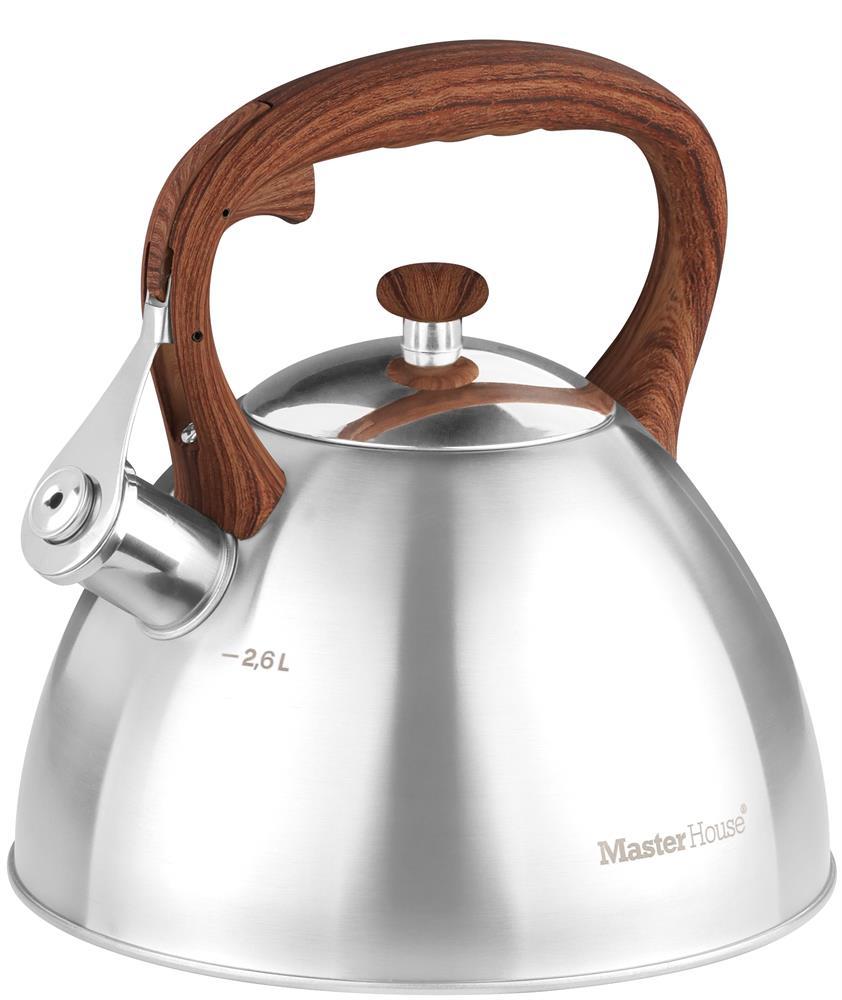 Чайник со свистком, объём 2,6 литра. Нержавеющая сталь 304 (18/10). Капсулированное дно с алюминиевой вставкой (толщина алюминия 2 мм) обеспечивает быстрое нагревание и равномерное распределение тепла, позволяет воде долго не остывать. Ненагревающаяся ручка с приятным покрытием soft-touch удобна и не скользит.Цвет: сталь, ручка дерево.